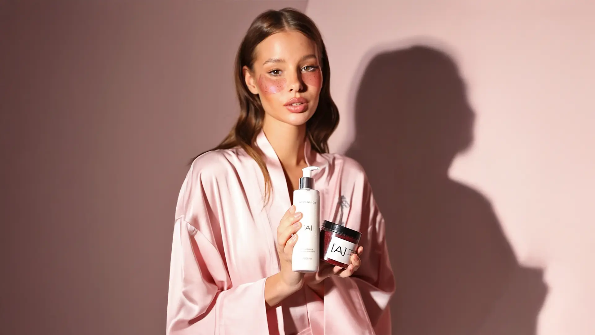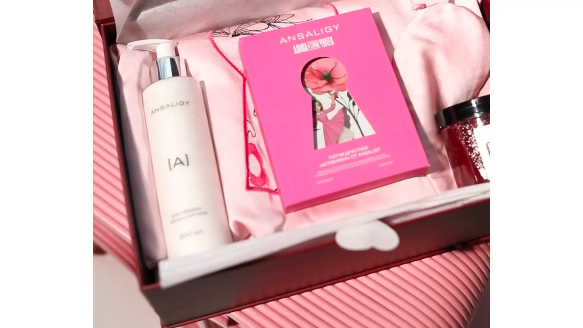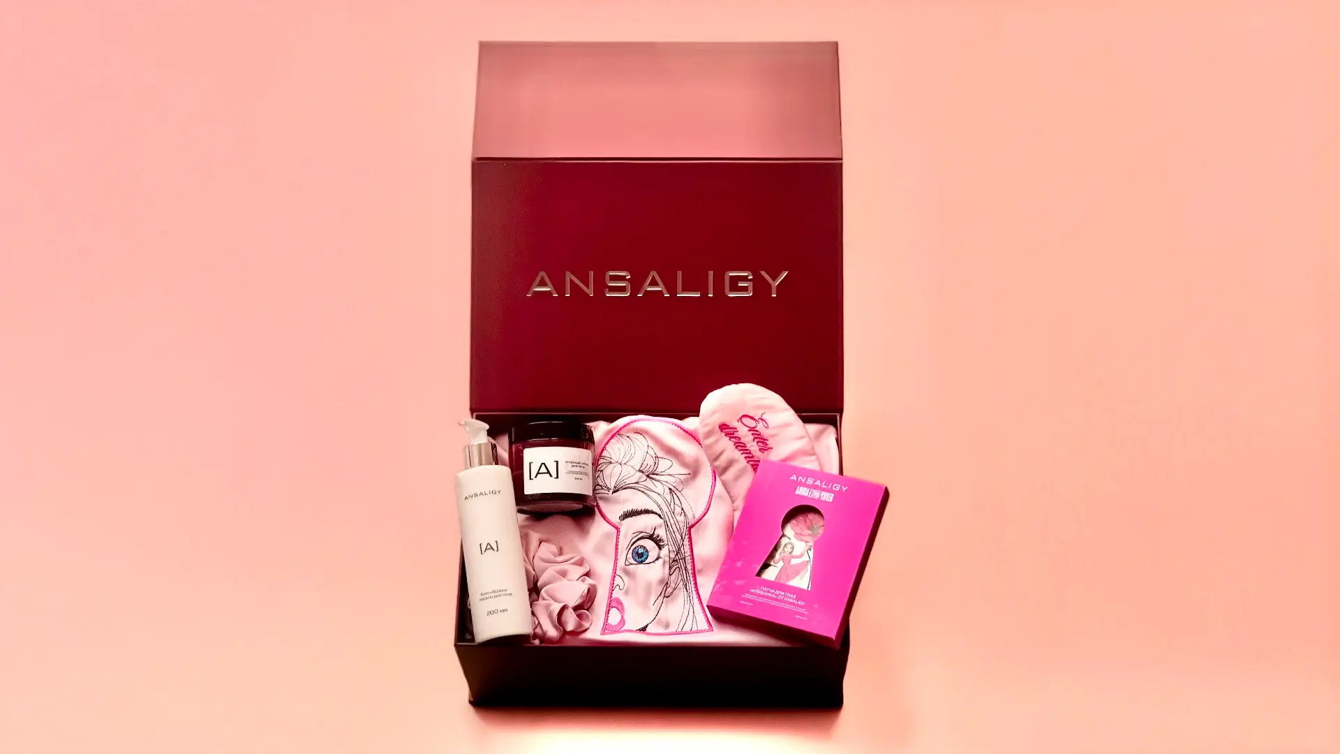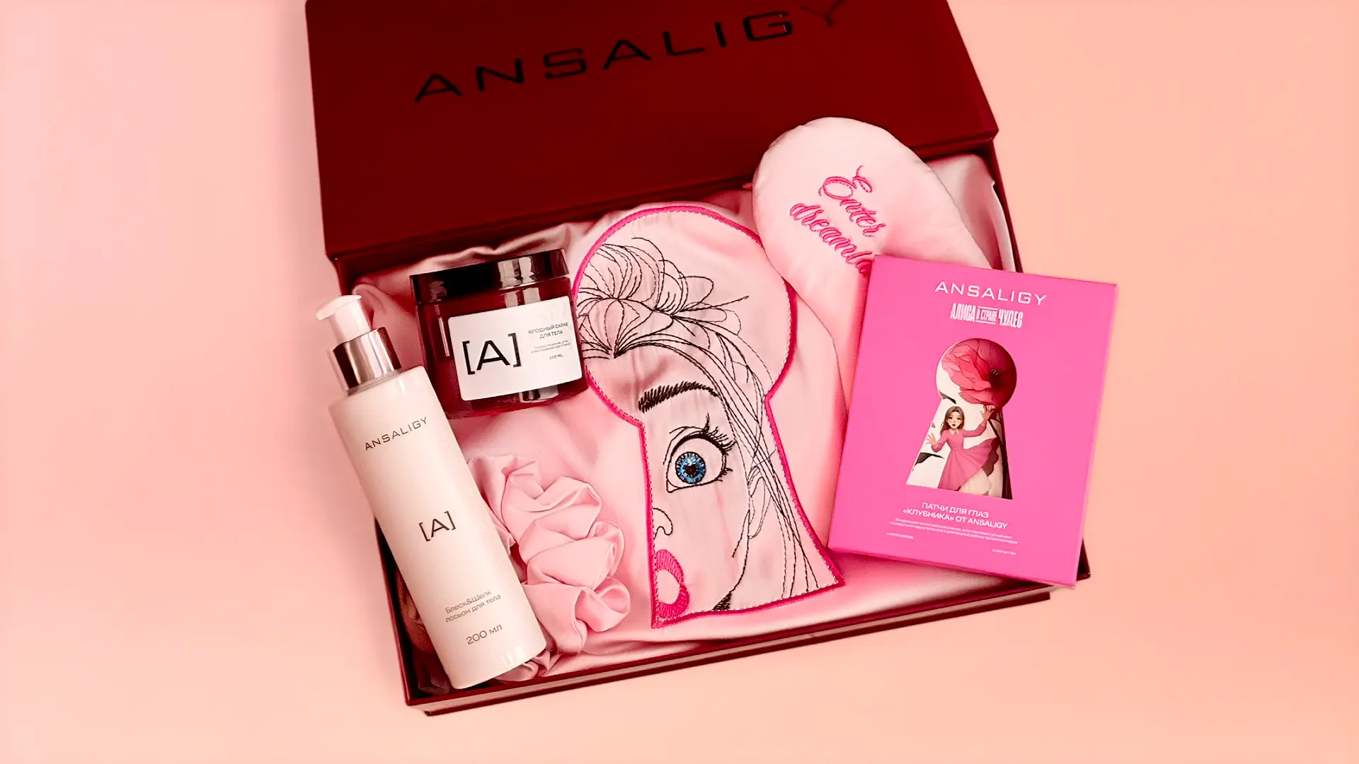 В наборе: самые свежие новинки ANSALIGY – ягодный скраб для тела и увлажняющий лосьон Блеск&Шёлк, упаковка из пяти патчей «Клубника» в эксклюзивном дизайне, халат Di Lino из мягчайшей вискозы с тематической вышивкой, резинка для волос и маска для сна с вышивкой Enter Dreamland.