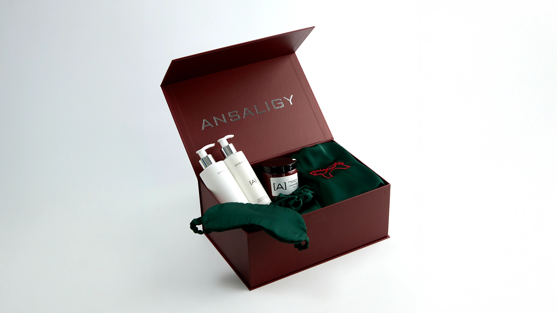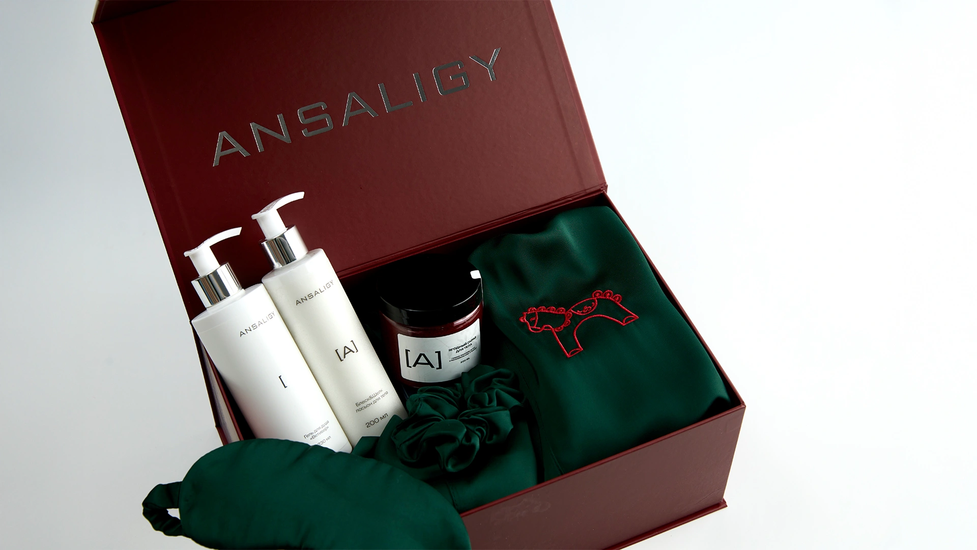 Внутри новогоднего набора: халат Di Lino с резинкой для волос и маской для сна, 2 упаковки новогодних патчей «Мандарин» и 2 упаковки патчей с центеллой азиатской в снежном саше, главная новинка этого года — комплексный уход за кожей лица ANSALIGY Pro-Vital, увлажняющий гель для душа ANSALIGY, ягодный детокс-скраб для тела и мерцающий лосьон для тела «Блеск & Шёлк».