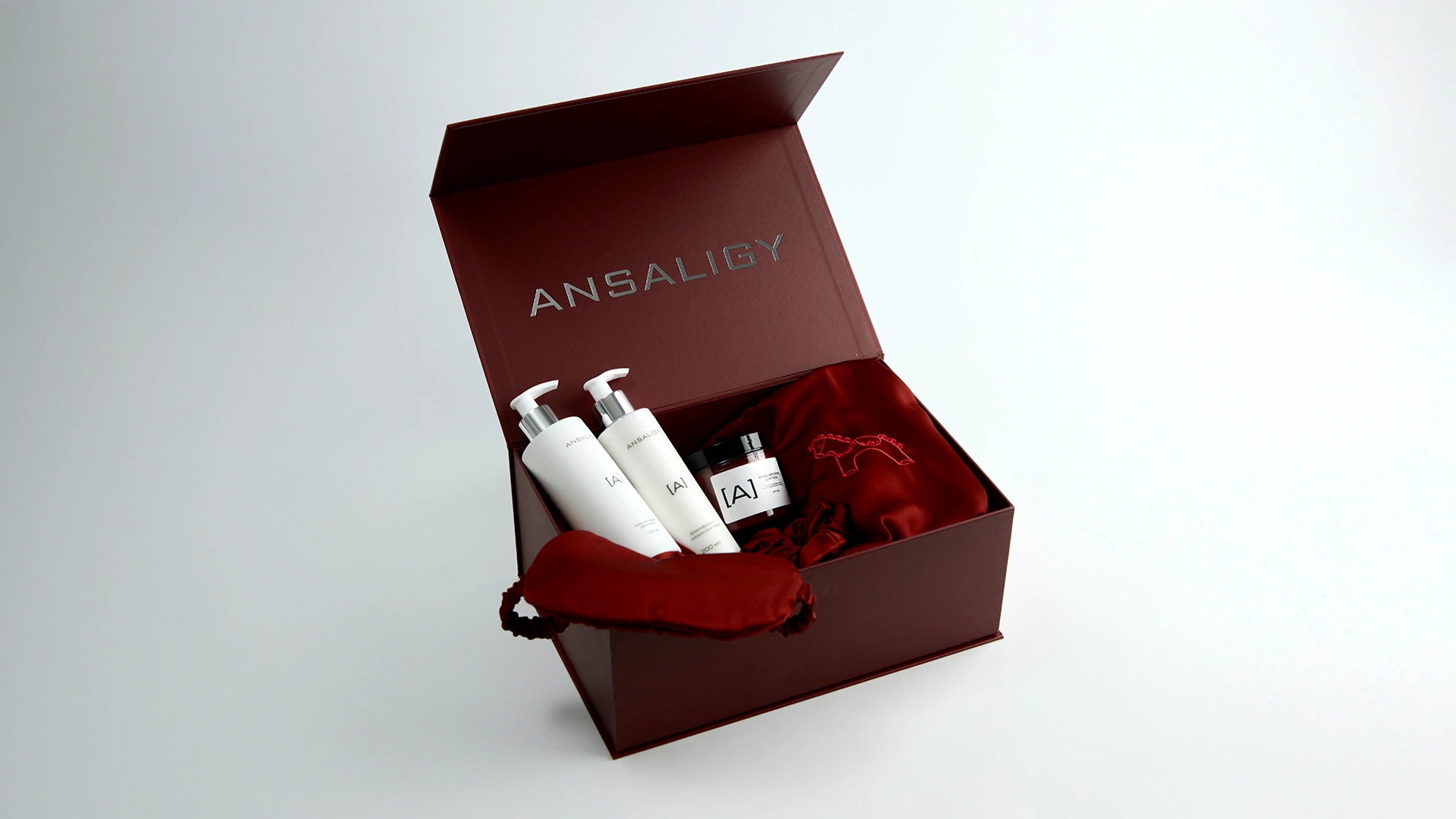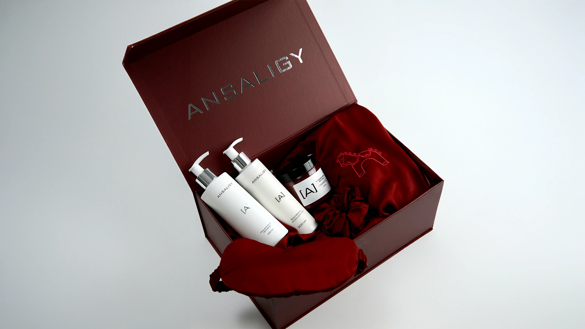 Внутри новогоднего набора: халат Di Lino с резинкой для волос и маской для сна, 2 упаковки новогодних патчей «Мандарин» и 2 упаковки патчей с центеллой азиатской в снежном саше, главная новинка этого года — комплексный уход за кожей лица ANSALIGY Pro-Vital, увлажняющий гель для душа ANSALIGY, ягодный детокс-скраб для тела и мерцающий лосьон для тела «Блеск & Шёлк».