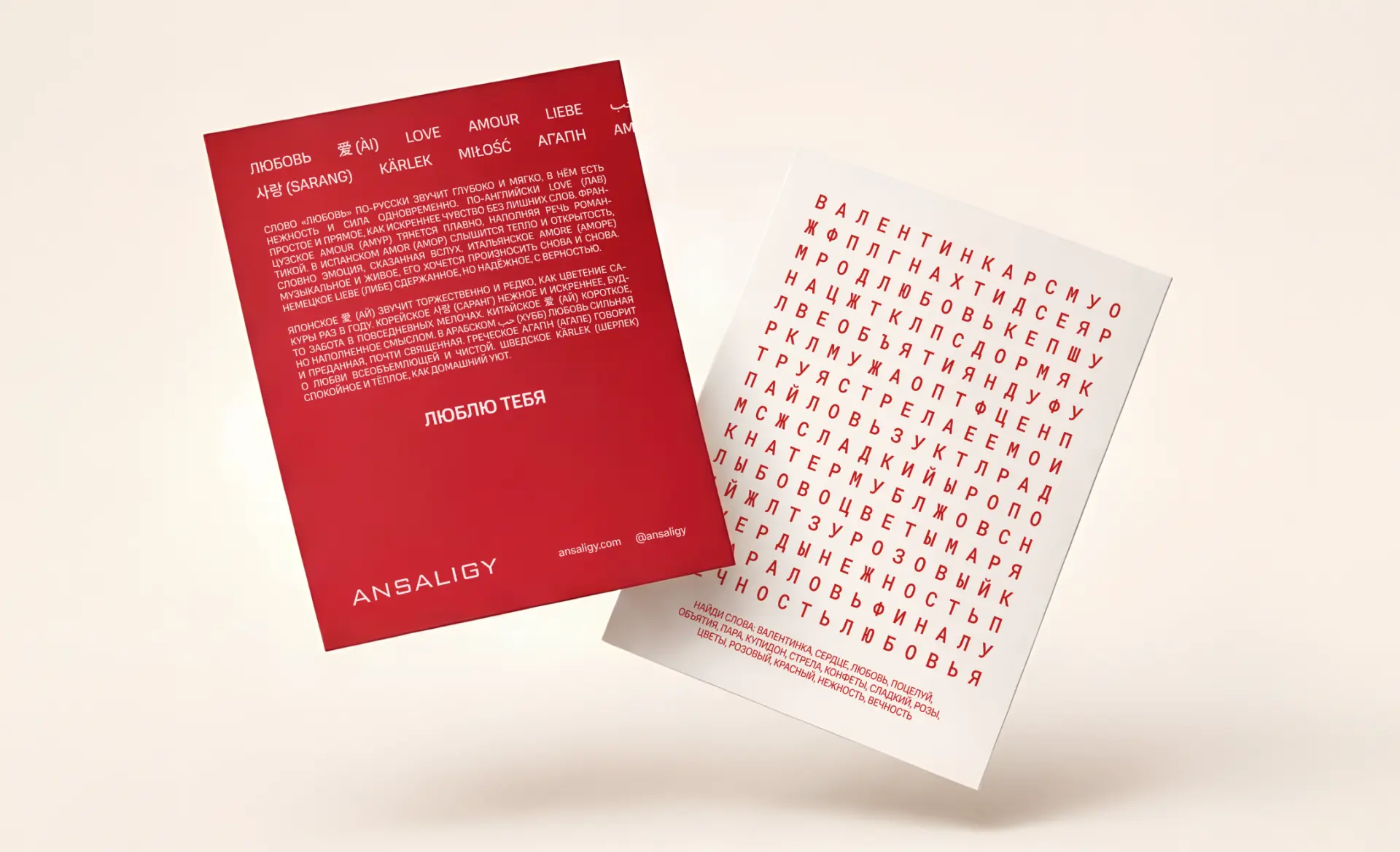 Ко Дню святого Валентина мы в ANSALIGY создали лимитированный набор патчей в подарочной упаковке-признании. Внутри — сердце, в котором спрятаны 5 пар культовых патчей с разными эффектами: для неё и для него, для утренней свежести и вечернего сияния, для спокойных моментов и быстрых сборов «через 30 минут». И — важное послание, которое остаётся дольше, чем сам праздник.